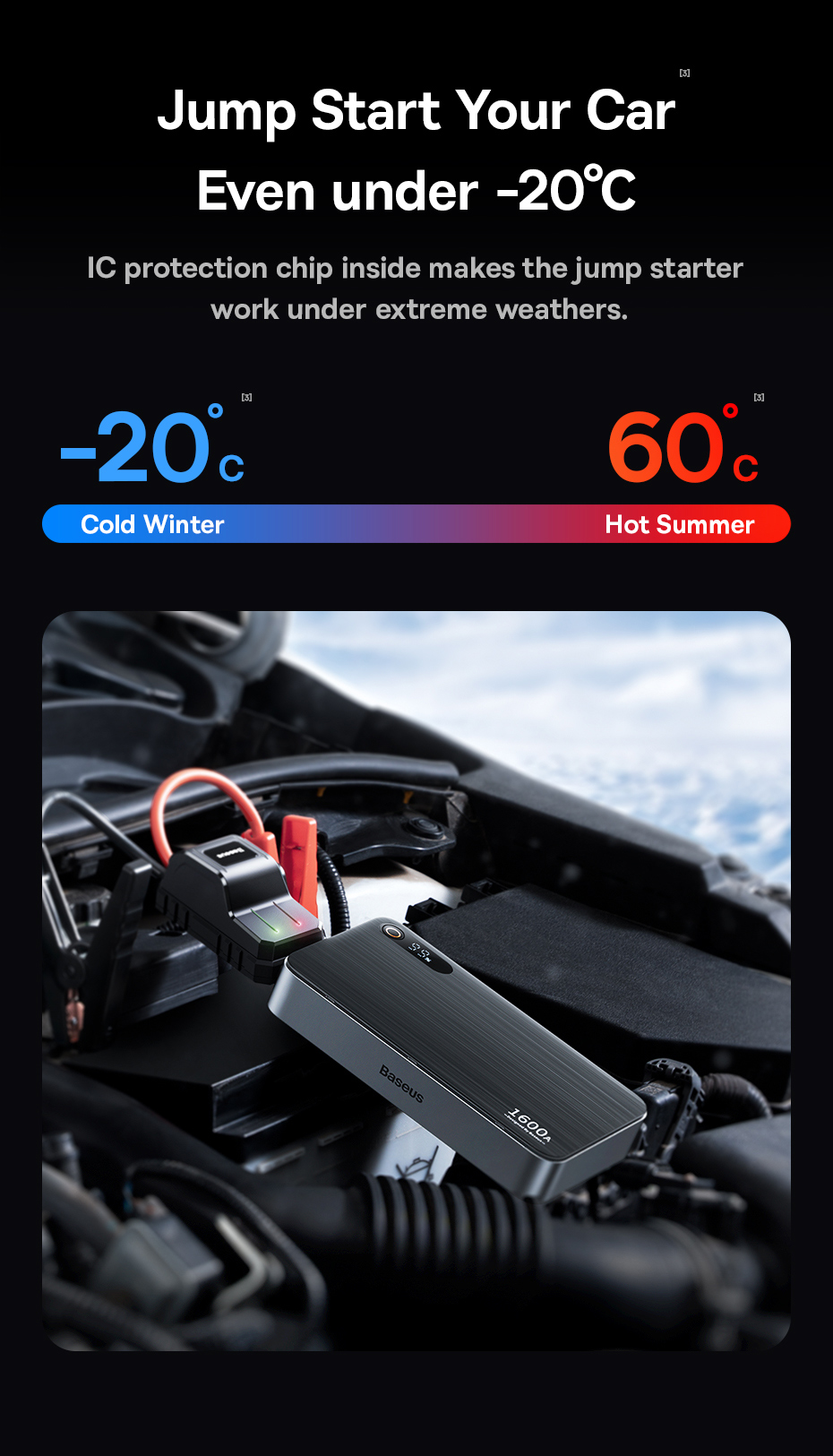 - Với nhiệt độ từ -20°C đến 60°C và mức pin ≥75%, sản phẩm này vẫn có thể khởi động xe ô tô chạy bằng xăng với dung tích 12V/3.5L hoặc xe ô tô chạy bằng dầu diesel với dung tích 12V/8.0L.