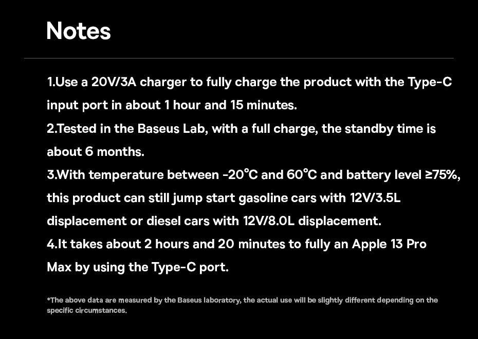 - Đã được kiểm tra tại phòng thí nghiệm của Baseus, với sạc đầy, thời gian chờ khoảng 6 tháng.