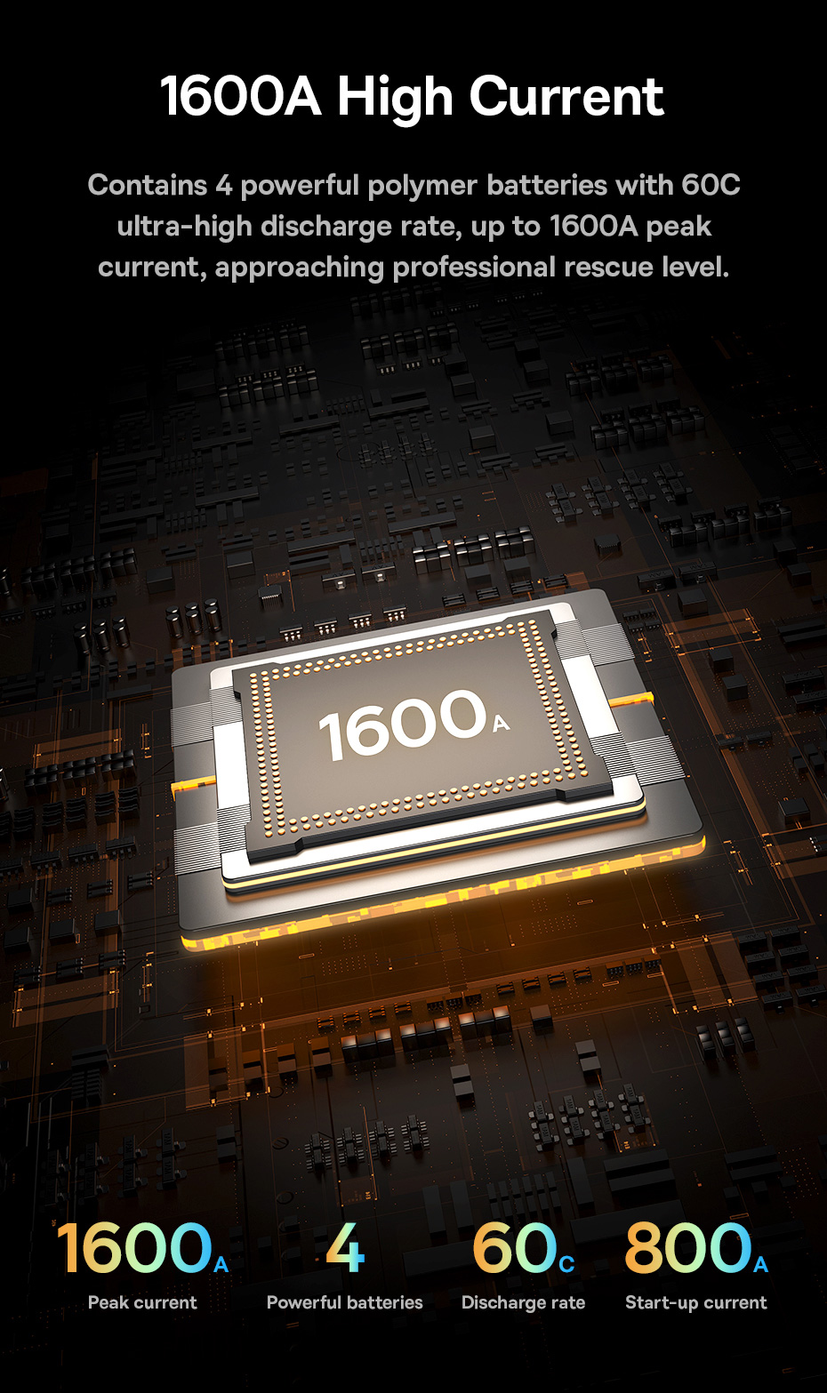 - Dòng điện cực đại 1600A: Với 4 viên pin polymer mạnh mẽ và dòng điện cực đại lên tới 1600A, sản phẩm này đảm bảo khả năng kích nguồn tốt nhất và chuyên nghiệp.